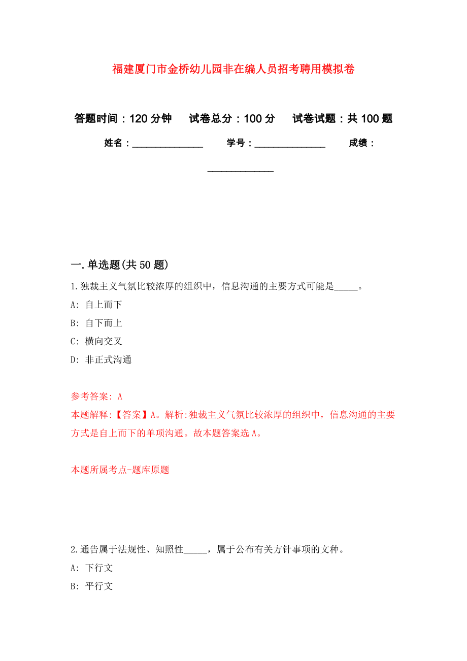 福建厦门市金桥幼儿园非在编人员招考聘用模拟卷答题时间:120分钟 试卷总分:100分 试卷试题:共100题姓名:_______________ 学号:_______________ 成绩:______________一.单选题(共50题)1.独裁主义气氛比较浓厚的组织中,信息沟通的主要方式可能是_____A: 自上而下B: 自下而上C: 横向交叉D: 非正式沟通参考答案: A本题解释:【答案】A解析:独裁主义气氛比较浓厚的组织中,信息沟通的主要方式是自上而下的单项沟通故本题答案选A本题所属考点-题库原题2.通告属于法规性、知照性_____,属于公布有关方针事项的文种A: 下行文B: 平行文C: 上行文D: 联合行文参考答案: A本题解释:【答案】A解析:通告适用于在一定范围内公布应当遵守或者周知的事项,属于法规性、知照性下行文 故本题答案选A本题所属考点-题库原题3.根据下面提供的信息,完成96~100题2013年8月份,社会消费品零售总额18886亿元,同比名义增长13.4%(扣除价格因素实际增长11.6%以下除特殊说明外均为名义增长)其中,限额以上企业(单位)消费品零售额9490亿元,增长11.5%。