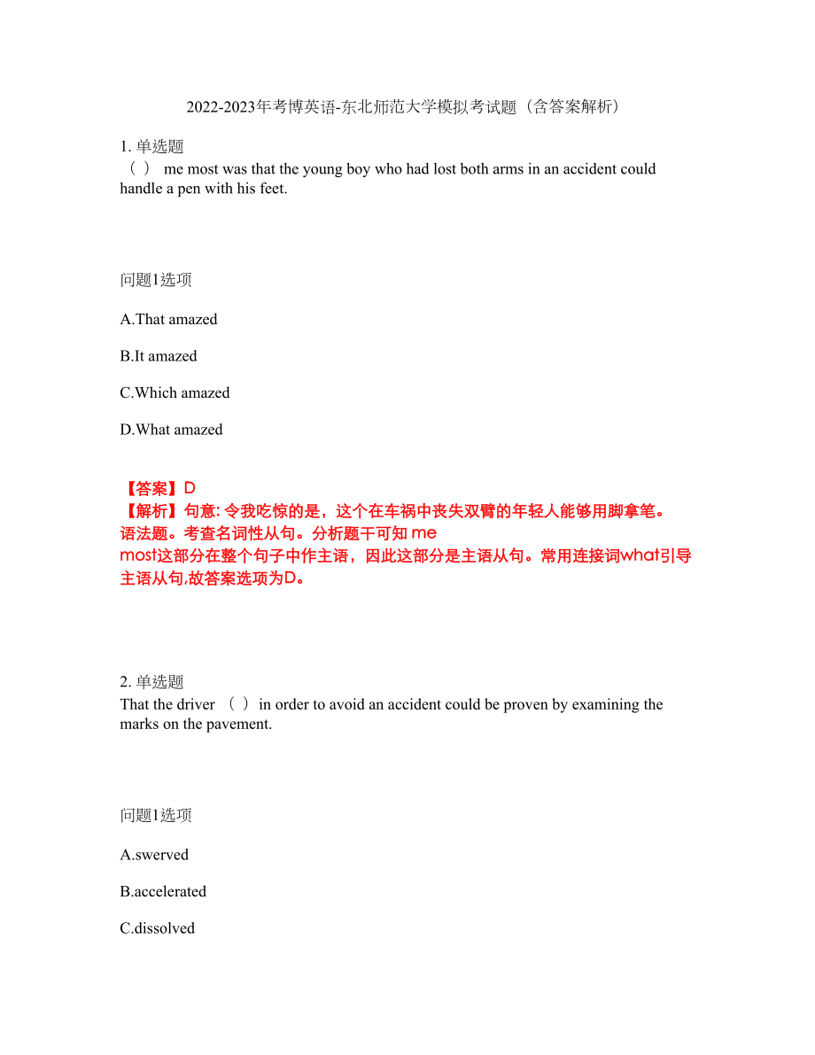 2022-2023年考博英语-东北师范大学模拟考试题(含答案解析)1. 单选题( ) me most was that the young boy who had lost both arms in an accident could handle a pen with his feet.问题1选项A.That amazedB.It amazedC.Which amazedD.What amazed【答案】D【解析】句意: 令我吃惊的是,这个在车祸中丧失双臂的年轻人能够用脚拿笔考查名词性从句分析题干可知 me most这部分在整个句子中作主语,因此这部分是主语从句常用连接词what引导主语从句,故答案选项为D2. 单选题That the driver ( )in order to avoid an accident could be proven by examining the marks on the pavement.问题1选项A.swervedB.acceleratedC.dissolvedD.withdrew【答案】A【解析】句意: 那个司机突然转向是为了避免意外发生,这可以通过检查路面印记予以证实。