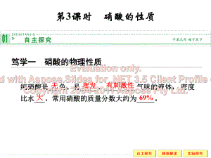 自主探究自主探究精要解读精要解读实验探究实验探究纯硝酸是纯硝酸是_色、易色、易_、_气味的液体,气味的液体,密度密度比水比水_,常用硝酸的质量分数大约为,常用硝酸的质量分数大约为_。笃学一硝酸的物理性质笃学一硝酸的物理性质第第3课时课时 硝酸的性质硝酸的性质无无挥发挥发有刺激性有刺激性大大69%自主探究自主探究精要解读精要解读实验探究实验探究1 不稳定性不稳定性笃学二硝酸的化学性质笃学二硝酸的化学性质光光受热受热浓度浓度NO2黄色黄色棕色棕色黑暗且温度低黑暗且温度低空气空气(或氧气或氧气)4NO2O22H2O=4HNO3自主探究自主探究精要解读精要解读实验探究实验探究2硝酸的强氧化性硝酸的强氧化性 (1)铜与浓、稀铜与浓、稀HNO3的反应的反应 铜与浓硝酸:铜与浓硝酸:_ _(实验室制实验室制NO2)离子方程式:离子方程式:_ 铜与稀硝酸:化学方程式:铜与稀硝酸:化学方程式:_ _(实验室制实验室制NO)离子方程式:离子方程式:_化学方程式:化学方程式:Cu4HNO3(浓浓)=Cu(NO3)22NO22H2OCu4H2NO3=Cu22NO22H2O3Cu8HNO3(稀稀)=3Cu(NO3)22NO4H2O3Cu8H2NO3=3Cu22NO4H2O自主探究自主探究精要解读精要解读实验探究实验探究常温下,浓硝酸能使铁常温下,浓硝酸能使铁(铝铝)发生发生_,这是因为,这是因为_。若在加热条件下,可破坏氧化。若在加热条件下,可破坏氧化膜,从而使反应膜,从而使反应_。钝化现象钝化现象浓硝酸把它们的表面氧化成一层薄而致密的氧化膜,阻止浓硝酸把它们的表面氧化成一层薄而致密的氧化膜,阻止了反应的进一步进行了反应的进一步进行继续进行继续进行自主探究自主探究精要解读精要解读实验探究实验探究硝酸是重要的化工原料,可用于制造炸药、染料、塑料和硝酸是重要的化工原料,可用于制造炸药、染料、塑料和硝酸盐等,也是实验室里必备的重要试剂。硝酸盐等,也是实验室里必备的重要试剂。王水是王水是_和和_按体积比按体积比_的混合物,能使的混合物,能使一些不溶于硝酸的金属如一些不溶于硝酸的金属如_、_等溶解。等溶解。笃学三硝酸的用途笃学三硝酸的用途浓硝酸浓硝酸浓盐酸浓盐酸1 3金金铂铂1.2自主探究自主探究精要解读精要解读实验探究实验探究2热交换器:热交换器:_;3吸收塔:吸收塔:_。笃学四工业制备硝酸笃学四工业制备硝酸2NOO2=2NO23NO2H2O=2HNO3NO1.自主探究自主探究精要解读精要解读实验探究实验探究将铁钉和铝片分别加入到浓硝酸中有什么现象。思将铁钉和铝片分别加入到浓硝酸中有什么现象。思考为什么?考为什么?提示提示铁、铝和浓硝酸在常温下反应,表面生成致密的氧铁、铝和浓硝酸在常温下反应,表面生成致密的氧化膜,阻止其继续反应,这种现象称为钝化,铁、铝在常化膜,阻止其继续反应,这种现象称为钝化,铁、铝在常温下和浓硫酸反应也有这种钝化现象。温下和浓硫酸反应也有这种钝化现象。为什么硝酸溶液通常呈现黄色?如何除去黄色?为什么硝酸溶液通常呈现黄色?如何除去黄色?提示提示硝酸溶液通常呈现黄色是由于其分解产物硝酸溶液通常呈现黄色是由于其分解产物NO2溶入溶入其中所致,可以通过向其中通入空气其中所致,可以通过向其中通入空气(或氧气或氧气)除去,发生除去,发生的反应方程式:的反应方程式:4NO2O22H2O=4HNO3。【慎思慎思1】【慎思慎思2】自主探究自主探究精要解读精要解读实验探究实验探究硝酸的不稳定性与挥发性有什么区别?硝酸的不稳定性与挥发性有什么区别?只用蓝色石蕊试纸如何鉴别三瓶失去标签的液体:浓只用蓝色石蕊试纸如何鉴别三瓶失去标签的液体:浓HCl、浓、浓H2SO4、浓、浓HNO3?提示提示各取少量试液分放于三支试管,分别用玻璃棒蘸取试各取少量试液分放于三支试管,分别用玻璃棒蘸取试液滴到湿润的蓝色石蕊试纸上液滴到湿润的蓝色石蕊试纸上(湿润的试纸先放在点滴板上湿润的试纸先放在点滴板上),再加热。再加热。现象是:现象是:浓硝酸:变红色浓硝酸:变红色红色褪去红色褪去(具有酸性、氧化性具有酸性、氧化性)。浓硫酸:变红色浓硫酸:变红色变黑色变黑色 (具有酸性、脱水性具有酸性、脱水性)。浓盐酸:变红色浓盐酸:变红色红色不变红色不变(具有酸性具有酸性)。【慎思慎思3】【慎思慎思4】自主探究自主探究精要解读精要解读实验探究实验探究1硝酸的强氧化性的原因硝酸的强氧化性的原因 由于由于HNO3分子中分子中5价的氮元素具有很强的得电子能价的氮元素具有很强的得电子能 力,在硝酸参与的氧化还原反应中,几乎全部是力,在硝酸参与的氧化还原反应中,几乎全部是5 价氮元素被还原,所以硝酸是强氧化性酸。价氮元素被还原,所以硝酸是强氧化性酸。2规律规律 (1)HNO3参与的氧化还原反应中,参与的氧化还原反应中,浓浓HNO3被还原为被还原为 NO2,稀,稀HNO3被还原为被还原为NO。(2)浓度越高,温度越高,浓度越高,温度越高,HNO3的氧化性越强。的氧化性越强。(3)还原剂一般被氧化成最高价态。还原剂一般被氧化成最高价态。要点一要点一|硝酸的性质硝酸的性质自主探究自主探究精要解读精要解读实验探究实验探究3表现表现 (1)对酸的通性的影响对酸的通性的影响 浓浓HNO3能使石蕊试液先变红,后褪色。能使石蕊试液先变红,后褪色。与活泼金属与活泼金属(如如Mg、Zn)反应不产生反应不产生H2,随着,随着HNO3 的浓度的降低,的浓度的降低,HNO