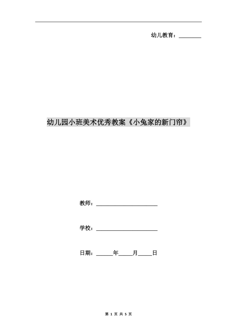 幼儿教育:________幼儿园小班美术优秀教案《小兔家的新门帘》教师:______________________学校:______________________日期:______年_____月_____日第 1 页 共 5 页幼儿园小班美术优秀教案《小兔家的新门帘》活动目标:1、认识长圆形、扇形、掌形的树叶,尝试将相同形状的树叶贴在一起帮小兔贴门帘2、通过贴门帘的游戏,体验帮助小兔的乐趣活动准备:1、课件《小兔家的新门帘》2、制作所需材料:背景板、固体胶、已打印好的树叶形状活动过程:一、故事引入,激发幼儿兴趣:——教师播放课件,请幼儿观赏——师:小兔家发生了什么?——继续观看故事——师:小兔用什么做门帘呢?——过渡:小兔用漂亮的树叶做门帘真聪明二、认识图形,挂窗帘:——师:小兔找到了几种树叶?一样吗?——小结:长得长长圆圆的叫长圆形;(教案出自:屈老师教案网)长得像扇子一样的叫扇形;长得像手掌一样的叫掌形三、学习做树叶门帘:——过渡:今天我们就用这些树叶给小兔做门帘——教师示范做门帘:拿起一片小树叶,涂涂涂,涂上固体胶;黏黏黏,粘在直线上四、大家来做门帘:——师:小兔还有好多门和窗没装上漂亮的帘子,请你们来帮助一下她好吗?——教师巡回指导,鼓励幼儿大胆粘贴。