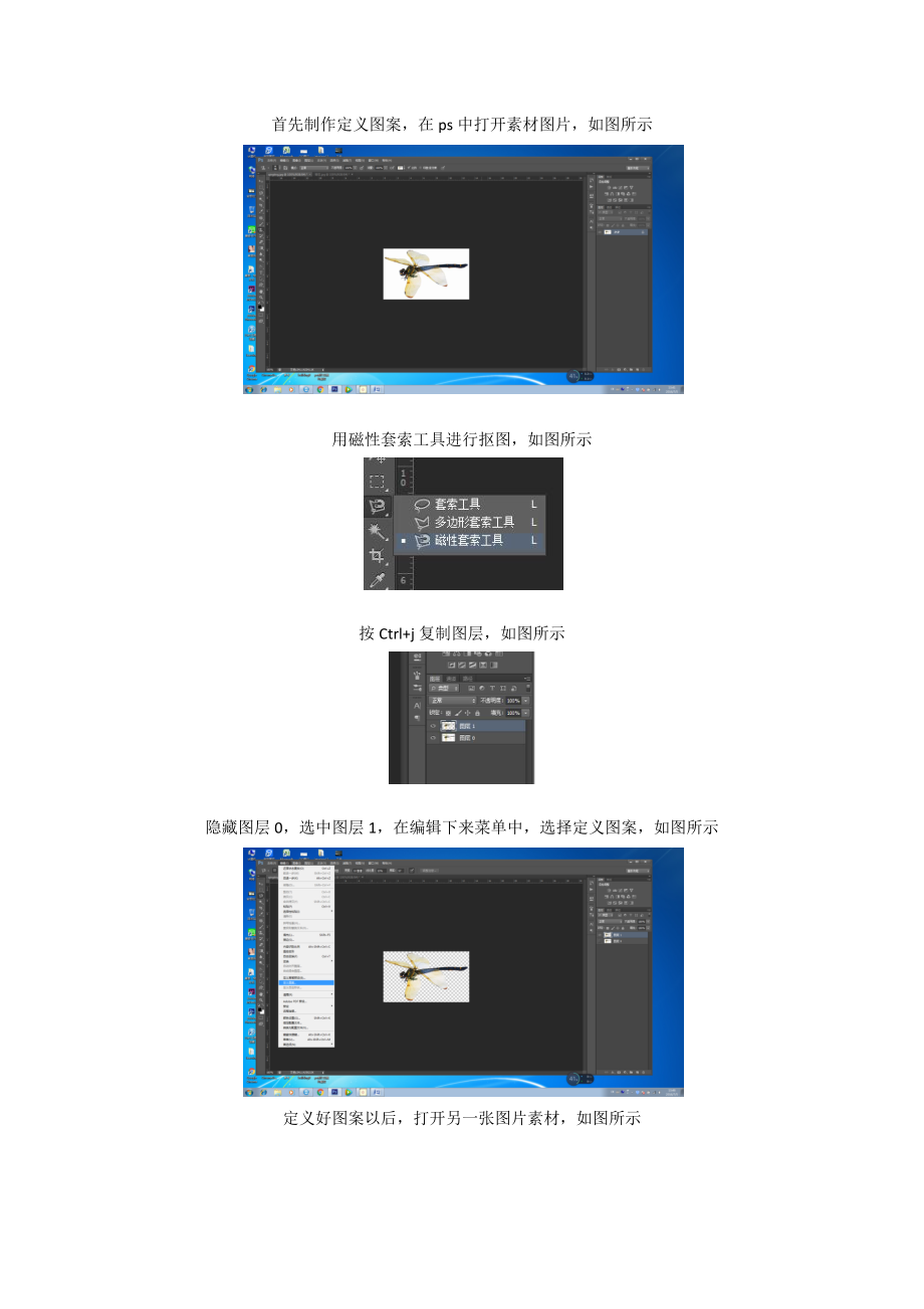首先制作定义图案,在ps中打开素材图片,如图所示用磁性套索工具进行抠图,如图所示按Ctrl+j复制图层,如图所示隐藏图层0,选中图层1,在编辑下来菜单中,选择定义图案,如图所示定义好图案以后,打开另一张图片素材,如图所示接着在左边选择,图案图章工具,如图所示选择刚刚定义好的图案,如图所示下来就可以在图片上进行涂抹,得到想要的效果,如图所示当然用图案图章工具涂抹出的图形是不能移动的,如果想要设计效果,那就配合抠出的蜻蜓进行图片组合,效果如图所示最终效果如图所示。