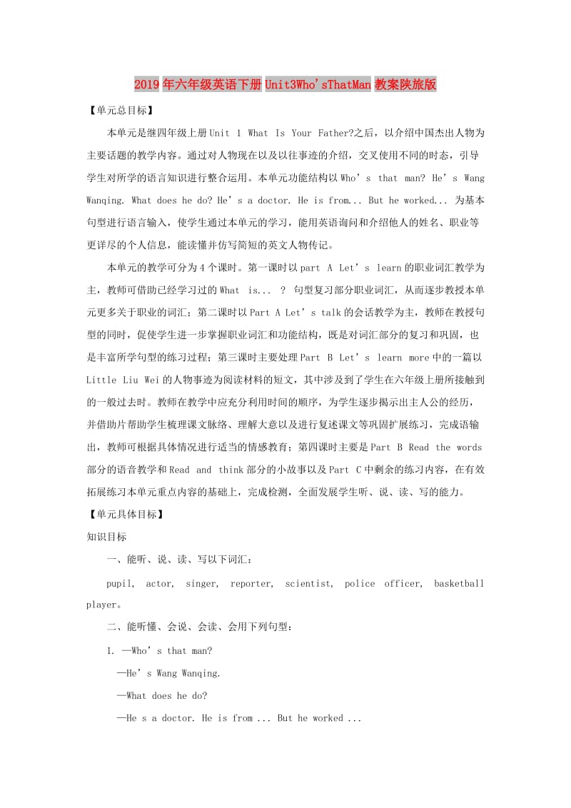 2019年六年级英语下册Unit3WhosThatMan教案陕旅版【单元总目标】本单元是继四年级上册Unit 1 What Is Your Father?之后,以介绍中国杰出人物为主要话题的教学内容通过对人物现在以及以往事迹的介绍,交叉使用不同的时态,引导学生对所学的语言知识进行整合运用本单元功能结构以Who’s that man? He’s Wang Wanqing. What does he do? He’s a doctor. He is from... But he worked... 为基本句型进行语言输入,使学生通过本单元的学习,能用英语询问和介绍他人的姓名、职业等更详尽的个人信息,能读懂并仿写简短的英文人物传记本单元的教学可分为4个课时第一课时以part A Let’s learn的职业词汇教学为主,教师可借助已经学习过的What is... ? 句型复习部分职业词汇,从而逐步教授本单元更多关于职业的词汇;第二课时以Part A Let’s talk的会话教学为主,教师在教授句型的同时,促使学生进一步掌握职业词汇和功能结构,既是对词汇部分的复习和巩固,也是丰富所学句型的练习过程;第三课时主要处理Part B Let’s learn more中的一篇以Little Liu Wei的人物事迹为阅读材料的短文,其中涉及到了学生在六年级上册所接触到的一般过去时。
