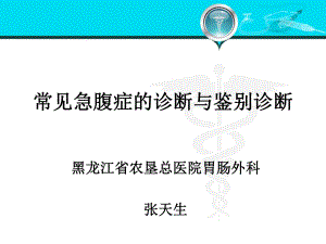 为了规范事业单位聘用关系,建立和完善适应社会主义市场经济体制的事业单位工作人员聘用制度,保障用人单位和职工的合法权益常见急腹症的诊断与鉴别诊断常见急腹症的诊断与鉴别诊断黑龙江省农垦总医院胃肠外科黑龙江省农垦总医院胃肠外科张天生张天生为了规范事业单位聘用关系,建立和完善适应社会主义市场经济体制的事业单位工作人员聘用制度,保障用人单位和职工的合法权益 急腹症(急腹症()是一组以急性腹痛)是一组以急性腹痛 为突出表现,起病急、进展快、病情重,常需为突出表现,起病急、进展快、病情重,常需要以手术治疗为主要手段的若干腹部疾病。要以手术治疗为主要手段的若干腹部疾病。(狭义)狭义)凡以急性腹痛作为主诉或主要临床表现均可称为凡以急性腹痛作为主诉或主要临床表现均可称为 急腹症。(广义)急腹症。(广义)(一)、急腹症定义为了规范事业单位聘用关系,建立和完善适应社会主义市场经济体制的事业单位工作人员聘用制度,保障用人单位和职工的合法权益急性腹痛诊治过程中面临的困惑发病急,进展快,变化多,病情重,短时间内常难于做出诊断。病变复杂多样,多与消化系统有关,但也可为全 身疾病伴随症状之一,涉及内、外、妇、儿等多学科疾病。常出现拖延诊断、检查或治疗不恰当,造成贻 误病情、人财浪费。为了规范事业单位聘用关系,建立和完善适应社会主义市场经济体制的事业单位工作人员聘用制度,保障用人单位和职工的合法权益(二)、腹痛的分类与临床特点(二)、腹痛的分类与临床特点 腹痛:是指腹部神经受到局部或全身理化因素刺腹痛:是指腹部神经受到局部或全身理化因素刺激后,所引起的一系列保护性防御反应的警戒信号。激后,所引起的一系列保护性防御反应的警戒信号。腹内病变引起腹痛的几类刺激:腹内病变引起腹痛的几类刺激:肠道扩张或收缩;肠道扩张或收缩;脏器牵拉、压迫、扭转;脏器牵拉、压迫、扭转;化学物质刺激(如炎症介质);化学物质刺激(如炎症介质);脏器缺血;脏器缺血;为了规范事业单位聘用关系,建立和完善适应社会主义市场经济体制的事业单位工作人员聘用制度,保障用人单位和职工的合法权益按神经支配、传导途径不同分类:按神经支配、传导途径不同分类:、躯体性腹痛(又称体干性腹痛、体性痛):、躯体性腹痛(又称体干性腹痛、体性痛):腹部脊神经受刺激所致;腹部脊神经受刺激所致;、内脏性腹痛:内脏神经受刺激引起;、内脏性腹痛:内脏神经受刺激引起;、感应性腹痛(又称牵涉痛、放射痛):内脏、感应性腹痛(又称牵涉痛、放射痛):内脏发生病变时常在体表的一定区域产生感觉过敏或疼痛发生病变时常在体表的一定区域产生感觉过敏或疼痛,这种现象称为感应性腹痛。这一感觉过敏或疼痛区,这种现象称为感应性腹痛。这一感觉过敏或疼痛区称为海德氏带。称为海德氏带。为了规范事业单位聘用关系,建立和完善适应社会主义市场经济体制的事业单位工作人员聘用制度,保障用人单位和职工的合法权益、躯体性腹痛的特点:、躯体性腹痛的特点:痛阈较低、痛觉敏感;痛阈较低、痛觉敏感;疼痛常伴有腹膜刺激症;疼痛常伴有腹膜刺激症;定位明确;定位明确;植物神经反射缺如或少见;植物神经反射缺如或少见;体格检查特点是肌紧张、反跳痛。体格检查特点是肌紧张、反跳痛。为了规范事业单位聘用关系,建立和完善适应社会主义市场经济体制的事业单位工作人员聘用制度,保障用人单位和职工的合法权益为了规范事业单位聘用关系,建立和完善适应社会主义市场经济体制的事业单位工作人员聘用制度,保障用人单位和职工的合法权益、感应性腹痛的特点:、感应性腹痛的特点:内脏痛不仅局部定位极不明确,而且局内脏痛不仅局部定位极不明确,而且局部标识易混,因而有时被感受为皮肤痛。部标识易混,因而有时被感受为皮肤痛。这被看作是因为内脏感觉纤维所产生的兴这被看作是因为内脏感觉纤维所产生的兴奋,在脊髓中扩散,波及到同节段皮肤传奋,在脊髓中扩散,波及到同节段皮肤传来的通道,再由投射而使该皮肤部位感到来的通道,再由投射而使该皮肤部位感到疼痛,甚至导致痛觉过敏症(发散投射说疼痛,甚至导致痛觉过敏症(发散投射说)。)。为了规范事业单位聘用关系,建立和完善适应社会主义市场经济体制的事业单位工作人员聘用制度,保障用人单位和职工的合法权益、感应性腹痛的特点:、感应性腹痛的特点:与各个脏器相对应的皮肤节段称为海德与各个脏器相对应的皮肤节段称为海德氏带(氏带()或痛带。如肝脏异常时,而第八)或痛带。如肝脏异常时,而第八和第九胸椎背根支配的那部分皮肤则感到和第九胸椎背根支配的那部分皮肤则感到疼痛。这样的海德氏带的疼痛称为感应痛疼痛。这样的海德氏带的疼痛称为感应痛或关连痛(或关连痛(),有助于内脏疾病的诊断,),有助于内脏疾病的诊断,同时对它的治疗反过来有时会感应到内部同时对它的治疗反过来有时会感应到内部。为了规范事业单位聘用关系,建立和完善适应社会主义市场经济体制的事业单位工作人员聘用制度,保障用人单位和职工的合法权益为了规范事业单位聘用关系,建立和完善适应社会主义市场经济体制的事业单位工作人员聘用制度,保障用人单位和职工的合法权益、按疼痛的