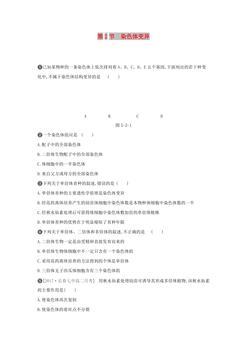 第2节 染色体变异 ❶已知某物种的一条染色体上依次排列着A、B、C、D、E五个基因,下面列出的若干种变化中,不属于染色体结构变异的是 ( )A B C D图5-2-1❷一个染色体组应是 ( )A.配子中的全部染色体B.二倍体生物配子中的全部染色体C.体细胞中的一半染色体D.来自父方或母方的全部染色体❸下列关于单倍体育种的叙述,错误的是 ( )A.单倍体育种的主要遗传学原理是染色体变异B.经花药离体培养产生的幼苗体细胞中染色体数是本物种体细胞中染色体数的一半C.经秋水仙素处理后可获得体细胞中染色体数加倍的单倍体植株D.单倍体育种的优势在于明显缩短了育种年限❹下列关于单倍体、二倍体和多倍体的叙述,不正确的是 ( )A.二倍体生物一定是由受精卵直接发育而来的B.单倍体生物体细胞中不一定只含有一个染色体组C.采用花药离体培养的方法得到的个体是单倍体D.三倍体无子西瓜体细胞含有三个染色体组❺[2017长春七中高二月考] 用秋水仙素处理幼苗可诱导其形成多倍体植物,该秋水仙素的主要作用是( )A.使染色体再次复制B.使染色体的着丝点不分裂C.抑制纺锤体的形成D.使细胞稳定在间期阶段❻下列有关“低温诱导植物染色体数目的变化”实验的叙述,正确的是 ( ) A.低温会抑制分裂时纺锤体的形成B.改良苯酚品红染液的作用是固定和染色C.固定和解离后的漂洗液都是体积分数为95%的酒精D.在高倍显微镜下可以观察到细胞从两个染色体组变为四个染色体组的过程❼[2017云南玉溪一中高二期中] 如图5-2-2中的甲、乙为染色体配对时出现的一种现象,丙、丁是染色体片段交换的现象,①至④是对这些现象出现的原因或结果的解释,其中全部正确的一项是 ( )图5-2-2①图甲的一条染色体可能有片段缺失 ②图乙的一条染色体可能有片段倒位 ③图丙会导致染色体片段重复 ④图丁会导致基因重组A.①③ B.②④C.①②③ D.①②④❽自然界中蝴蝶的性别决定方式为ZW型。