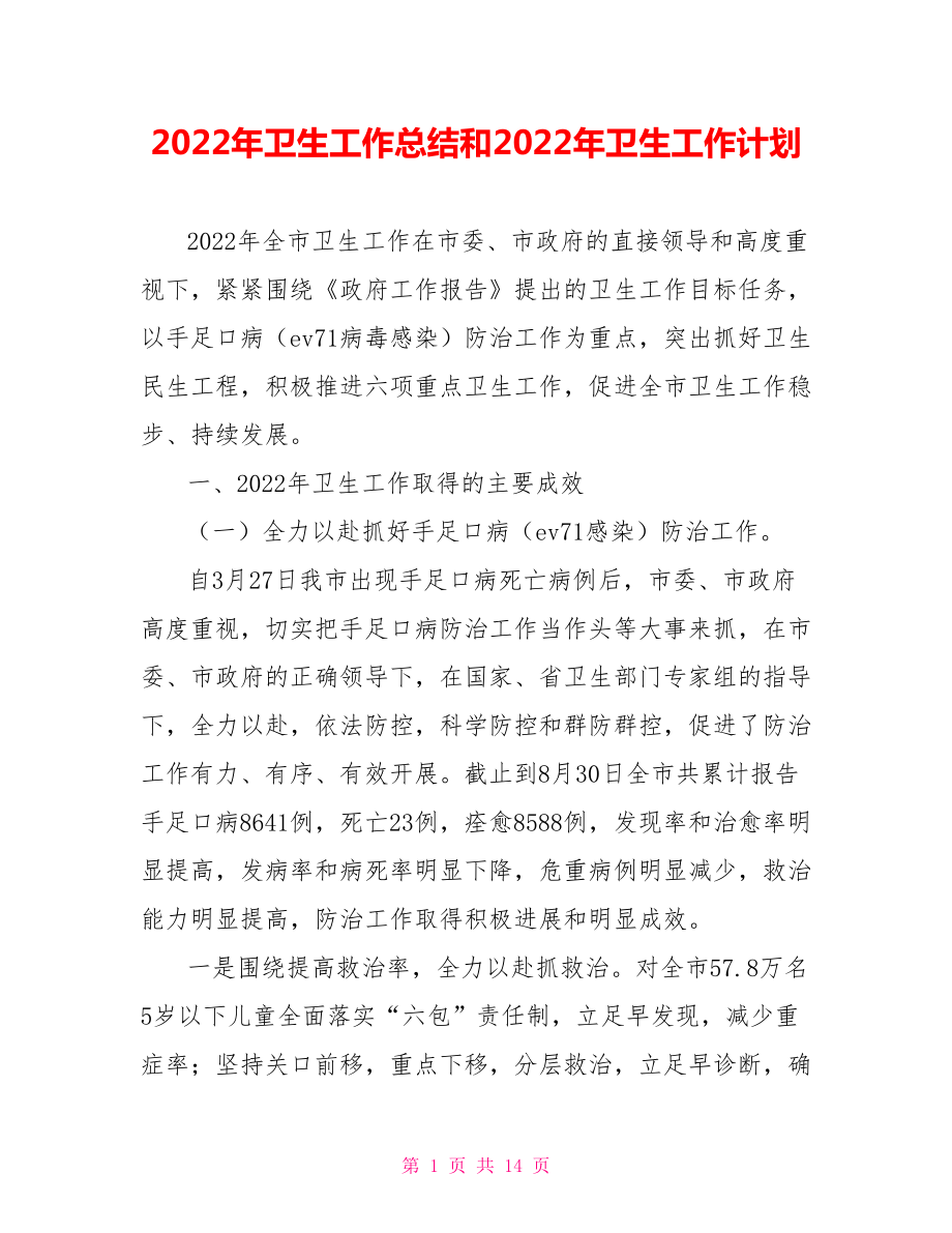 2022年卫生工作总结和2022年卫生工作计划2022年全市卫生工作在市委、市政府的直接领导和高度重视下,紧紧围绕《政府工作报告》提出的卫生工作目标任务,以手足口病(ev71病毒感染)防治工作为重点,突出抓好卫生民生工程,积极推进六项重点卫生工作,促进全市卫生工作稳步、持续发展一、2022年卫生工作取得的主要成效(一)全力以赴抓好手足口病(ev71感染)防治工作自3月27日我市出现手足口病死亡病例后,市委、市政府高度重视,切实把手足口病防治工作当作头等大事来抓,在市委、市政府的正确领导下,在国家、省卫生部门专家组的指导下,全力以赴,依法防控,科学防控和群防群控,促进了防治工作有力、有序、有效开展截止到8月30日全市共累计报告手足口病8641例,死亡23例,痊愈8588例,发现率和治愈率明显提高,发病率和病死率明显下降,危重病例明显减少,救治能力明显提高,防治工作取得积极进展和明显成效一是围绕提高救治率,全力以赴抓救治对全市57.8万名5岁以下儿童全面落实“六包”责任制,立足早发现,减少重症率;坚持关口前移,重点下移,分层救治,立足早诊断,确保救治率;加强各级医疗救治队伍培训,市组织市、县、乡三级20期医务人员业务知识培训,受训人员达6548人次,卫生部专家举办县级以上医疗机构儿科、感染科医护人员培训班4期。