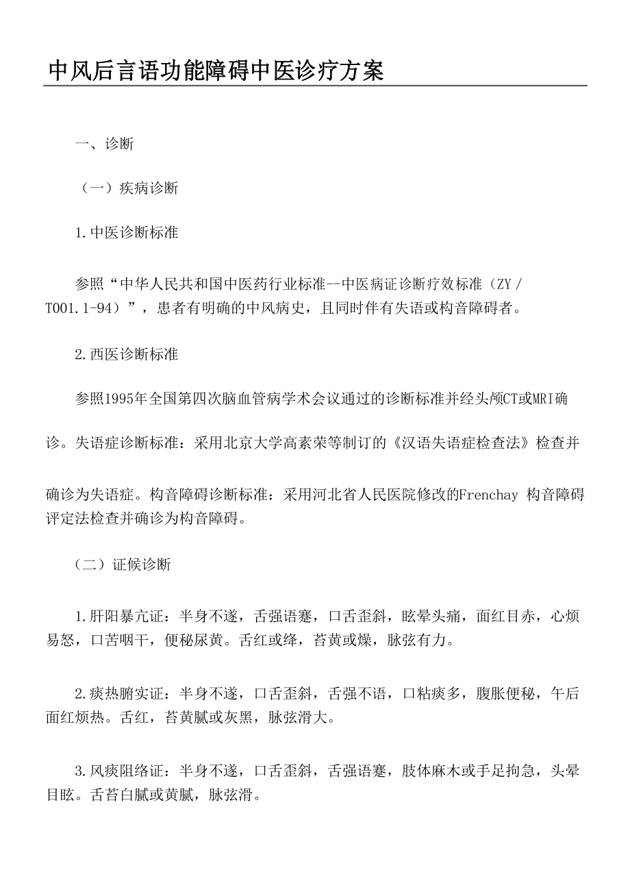 中风后言语功能障碍中医诊疗方案一、诊断(一)疾病诊断1.中医诊断标准参照“中华人民共和国中医药行业标准--中医病证诊断疗效标准(ZY/ T001.1-94)”,患者有明确的中风病史,且同时伴有失语或构音障碍者2.西医诊断标准参照1995年全国第四次脑血管病学术会议通过的诊断标准并经头颅CT或MRI确诊失语症诊断标准:采用北京大学高素荣等制订的《汉语失语症检查法》检查并确诊为失语症构音障碍诊断标准:采用河北省人民医院修改的Frenchay 构音障碍 评定法检查并确诊为构音障碍二)证候诊断1. 肝阳暴亢证:半身不遂,舌强语蹇,口舌歪斜,眩晕头痛,面红目赤,心烦 易怒,口苦咽干,便秘尿黄舌红或绛,苔黄或燥,脉弦有力2. 痰热腑实证:半身不遂,口舌歪斜,舌强不语,口粘痰多,腹胀便秘,午后 面红烦热舌红,苔黄腻或灰黑,脉弦滑大3. 风痰阻络证:半身不遂,口舌歪斜,舌强语蹇,肢体麻木或手足拘急,头晕 目眩舌苔白腻或黄腻,脉弦滑4. 阴虚风动证:半身不遂,肢体麻木,舌强语蹇,心烦失眠,眩晕耳鸣,手足 拘挛或蠕动舌红或黯淡,苔少或光剥,脉细弦或数5. 气虚血瘀证:半身不遂,肢体软弱,偏身麻木,舌强语蹇,手足肿胀,面色 淡白、气短乏力,心悸自汗。