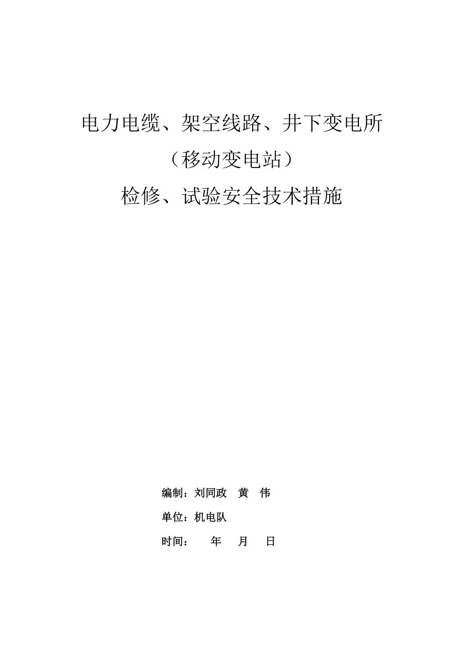 电力电缆、架空线路、井下变电所(移动变电站)检修、试验安全技术措施编制:刘同政 黄 伟 单位:机电队时间: 年 月 日电力电缆、架空线路、井下变电所(移动变电站)检修、试验安全技术措施一、工程概况:机电队辖区内所有电力电缆、架空线路、井下变电所(移动变电站)二、工作负责人:耿华虎三、技术负责人:刘同政 黄 伟四、安全技术措施一般规定: 1、电气试验工、电气维修工严格执行《煤矿电气试验规程》及《电业安全规程》规定; 2、电气试验工作应遵守《煤矿安全规程》及《电业安全规程》的规定,主要设备拆、接线工作应由该设备的维修人员担任; 3、试验人员必须有试验技术合格证,方可上岗作业; 4、做井下电气试验时,电源线不应使用塑料线,瓦斯浓度应保持在1%以下,在高瓦斯矿井的掘进头和采煤巷道,可能有发生瓦斯突然出现的地区,要有专用的局扇,并有瓦斯检查员值班方可进行试验; 5、严格按照《电气试验规程》及《煤矿安全规程》要求进行其所管辖的电气、安全绝缘用具、供电电缆的周期性试验,和各变电所继电保护装置的整定、拆除、安装工作; 6、必须熟练掌握试验设备的工作原理、性能、结构特点和运行方法; 7、电气试验工作不得少于两人,试验前每个人应明确试验内容和安全注意事项,坚守岗位,各行其责; 8、试验人员应熟知试验仪器、仪表的性能和使用方法; 9、试验前必须了解试验现场,熟知有关的技术资料。