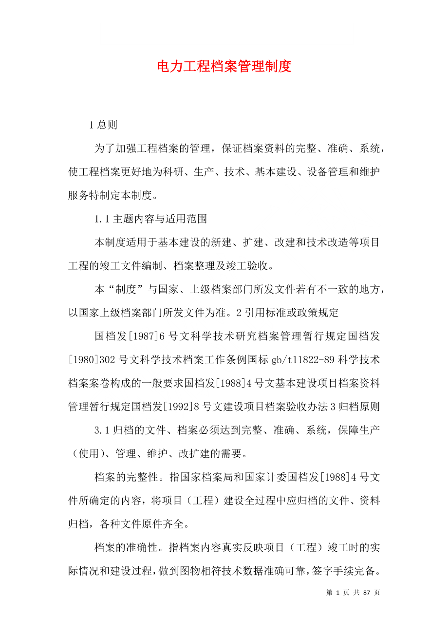书山有路勤为径,学海无涯苦作舟电力工程档案管理制度 1总则 为了加强工程档案的管理,保证档案资料的完整、准确、系统,使工程档案更好地为科研、生产、技术、基本建设、设备管理和维护服务特制定本制度 1.1主题内容与适用范围 本制度适用于基本建设的新建、扩建、改建和技术改造等项目工程的竣工文件编制、档案整理及竣工验收 本“制度”与国家、上级档案部门所发文件若有不一致的地方,以国家上级档案部门所发文件为准2引用标准或政策规定 国档发[1987]6号文科学技术研究档案管理暂行规定国档发[1980]302号文科学技术档案工作条例国标gb/t11822-89科学技术档案案卷构成的一般要求国档发[1988]4号文基本建设项目档案资料管理暂行规定国档发[1992]8号文建设项目档案验收办法3归档原则 3.1归档的文件、档案必须达到完整、准确、系统,保障生产(使用)、管理、维护、改扩建的需要 档案的完整性指国家档案局和国家计委国档发[1988]4号文件所确定的内容,将项目(工程)建设全过程中应归档的文件、资料归档,各种文件原件齐全 档案的准确性。