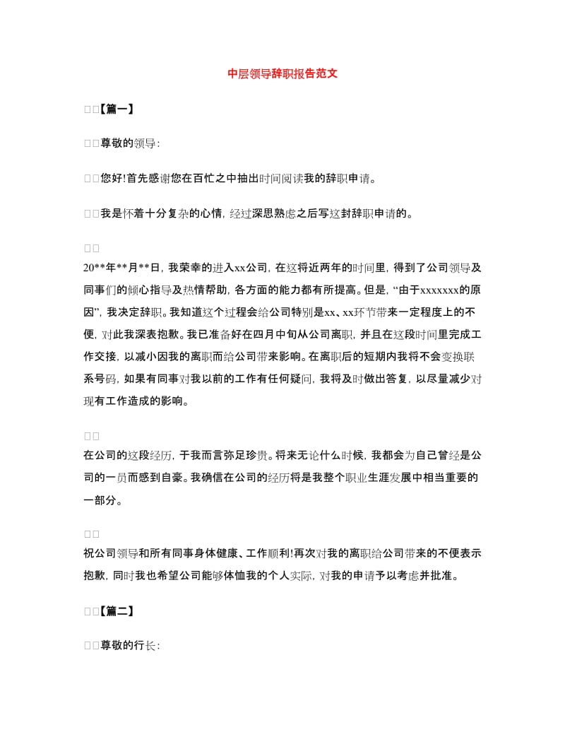 中层领导辞职报告范文 【篇一】 尊敬的领导: 您好!首先感谢您在百忙之中抽出时间阅读我的辞职申请 我是怀着十分复杂的心情,经过深思熟虑之后写这封辞职申请的 20**年**月**日,我荣幸的进入xx公司,在这将近两年的时间里,得到了公司领导及同事们的倾心指导及热情帮助,各方面的能力都有所提高但是,“由于xxxxxxx的原因”,我决定辞职我知道这个过程会给公司特别是xx、xx环节带来一定程度上的不便,对此我深表抱歉我已准备好在四月中旬从公司离职,并且在这段时间里完成工作交接,以减小因我的离职而给公司带来影响在离职后的短期内我将不会变换联系号码,如果有同事对我以前的工作有任何疑问,我将及时做出答复,以尽量减少对现有工作造成的影响 在公司的这段经历,于我而言弥足珍贵将来无论什么时候,我都会为自己曾经是公司的一员而感到自豪我确信在公司的经历将是我整个职业生涯发展中相当重要的一部分 祝公司领导和所有同事身体健康、工作顺利!再次对我的离职给公司带来的不便表示抱歉,同时我也希望公司能够体恤我的个人实际,对我的申请予以考虑并批准 【篇二】 尊敬的行长: 我带着复杂的心情写这封辞职报告。