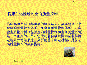 2022-11-161临床生化检验的全面质量控制临床生化检验的全面质量控制 临床实验室要获得可靠的测定结果,需要建立一个临床实验室要获得可靠的测定结果,需要建立一个全面的质量管理体系。在全面质量管理体系中,实全面的质量管理体系。在全面质量管理体系中,实验室质量控制验室质量控制 (包括室内质量控制和室问质量评价包括室内质量控制和室问质量评价)是一个重要的环节。它控制着自吸取样本至获得测是一个重要的环节。它控制着自吸取样本至获得测定结果并对结果进行分析的整个测定过程,是保证定结果并对结果进行分析的整个测定过程,是保证高质量操作的必要措施。高质量操作的必要措施。2022-11-162一、全面质量控制的内容一、全面质量控制的内容 全面质量控制的内容主要包括标本分析前、分析中全面质量控制的内容主要包括标本分析前、分析中和分析后的三个质控。和分析后的三个质控。分析前质量保证的内容主要为:分析前质量保证的内容主要为:人员的素质和人员的素质和稳定性;稳定性;实验室的设置和工作环境;实验室的设置和工作环境;实验仪实验仪器的质量保证;器的质量保证;检测方法的选择和评价;检测方法的选择和评价;试试剂盒的选择与评价;剂盒的选择与评价;病人准备;病人准备;标本的采集、标本的采集、处理和储存;处理和储存;实验室用水等。实验室用水等。2022-11-163 分析中质量控制的内容主要包括:分析中质量控制的内容主要包括:标本的正确处标本的正确处理和应用;理和应用;项目操作规程的建立;项目操作规程的建立;室内质控室内质控和结果分析;和结果分析;登记和填发报告等。登记和填发报告等。分析后质量评估的内容主要有:分析后质量评估的内容主要有:运送实验报告;运送实验报告;室内质控的数据管理;室内质控的数据管理;参加室间评质;参加室间评质;病病人投诉调查;人投诉调查;临床信息反馈等。临床信息反馈等。2022-11-164二、标本采集与处理二、标本采集与处理 1血标本采集前应注意的事项血标本采集前应注意的事项 标本采集前影响标本采集前影响血液成分变化的因素主要有生理、饮食、药物和采血液成分变化的因素主要有生理、饮食、药物和采血时间等。采血时间宜在早晨空腹血时间等。采血时间宜在早晨空腹612小时后进小时后进行,这样血浆组成物质的浓度相对比较稳定,其分行,这样血浆组成物质的浓度相对比较稳定,其分析的结果才具有代表性。析的结果才具有代表性。2022-11-165 2血标本采集时应注意的事项血标本采集时应注意的事项 应尽量避免溶血。应尽量避免溶血。防止溶血的办法有:防止溶血的办法有:抽血器和容器必须干燥洁净,抽血器和容器必须干燥洁净,因为红细胞遇水即会溶血,应尽量使用一次性抽血因为红细胞遇水即会溶血,应尽量使用一次性抽血器;器;不用或短时间使用止血带,忌长时间压迫血不用或短时间使用止血带,忌长时间压迫血管;管;抽血后取下针头再将血液沿容器壁徐徐注入抽血后取下针头再将血液沿容器壁徐徐注入容器内,切勿用力过猛;容器内,切勿用力过猛;若需血浆可用抗凝管作若需血浆可用抗凝管作容器,应轻轻倒转容器与抗凝剂混匀,切勿用力振容器,应轻轻倒转容器与抗凝剂混匀,切勿用力振摇。摇。3血标本采集后应注意的事项血标本采集后应注意的事项 采血后应尽快分采血后应尽快分离血清(浆),一般不应超过离血清(浆),一般不应超过2小时,并及时测定,小时,并及时测定,必要时可置冰箱保存。必要时可置冰箱保存。2022-11-166三、分析仪器的质量保证三、分析仪器的质量保证 分析仪器的质量管理包括:分析仪器的质量管理包括:建立仪器的相关记录建立仪器的相关记录;建立仪器的操作程序建立仪器的操作程序;建立仪器的检定与校建立仪器的检定与校准程序准程序;仪器的比对确保结果的一致性。仪器的比对确保结果的一致性。2022-11-167四、四、室内质量控制室内质量控制(Internal quality control,IQC)(一一)室内质量控制的目的室内质量控制的目的 室内质量控制是由实验室的工作人员采用一系列统室内质量控制是由实验室的工作人员采用一系列统计学的方法,连续地评价本实验室测定工作的可靠计学的方法,连续地评价本实验室测定工作的可靠程度。判断检验报告是否可发出的过程。室内质量程度。判断检验报告是否可发出的过程。室内质量控制的目的是检测、控制本实验室测定工作的精密控制的目的是检测、控制本实验室测定工作的精密度,并检测其准确度的改变,提高常规测定工作的度,并检测其准确度的改变,提高常规测定工作的批间、批内标本检测结果的一致性。批间、批内标本检测结果的一致性。2022-11-168 (二二)开展室内质量控制前的准备工作开展室内质量控制前的准备工作 1培训实验室工作人员:在开展质控前,每个实培训实验室工作人员:在开展质控前,每个实验室工作人员都应对质量控制的重要性、基础知识、验室工作人员都应对质量控制的重要性、基础知识、一般方法有较充分的了解,并在质量控制的实际过一般方法有较充分的了解,并在质量控制的实际过程中不断进行培训提高,在实际工作中培养一些质程中不断进行培训提高,在实际工作中培养一些质量控制工作的技术骨干。量控制工作的技术骨干。2建立标准