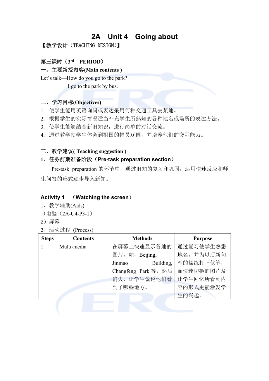 2A Unit 4 Going about【教学设计(TEACHING DESIGN)】第三课时(3rd PERIOD)一、主要新授内容(Main contents )Let’s talk—How do you go to the park? I go to the park by bus.二、学习目标(Objectives)1. 使学生能用英语询问或表达采用何种交通工具去某地2. 根据学生的实际情况适当补充学生所熟知的各种地名或场所的表达方法3. 使学生能够结合新旧知识,进行简单的对话交流4. 通过教学使学生体会到祖国的幅员辽阔,并培养他们的交际能力三、教学建议( Teaching suggestion )1、 任务前期准备阶段(Pre-task preparation section)Pre-task preparation的环节中,通过旧知的复习和巩固,运用快速反应和师生问答的形式逐步导入新知Activity 1 (Watching the screen) 1、教学辅助(Aids)1)电脑(2A-U4-P3-1)2)屏幕2、活动过程 (Process)StepsContentsMethodsPurpose1Multi-media在屏幕上快速显示各地的图片,如,Beijing, Jinmao Building, Changfeng Park等,然后消失,让学生说说他们看到了哪些地方。