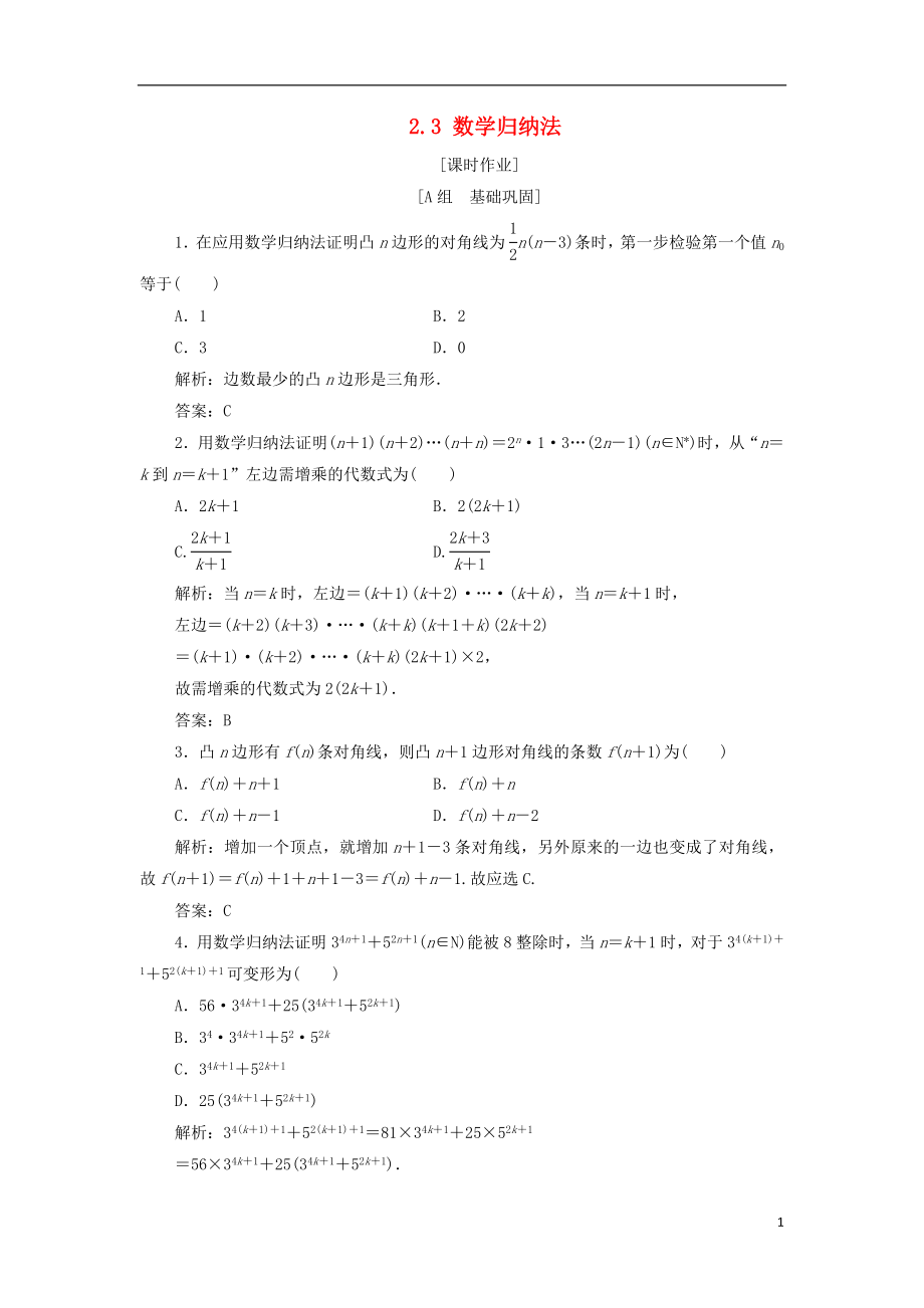 2.3 数学归纳法[课时作业][A组 基础巩固]1.在应用数学归纳法证明凸n边形的对角线为n(n-3)条时,第一步检验第一个值n0 等于( )A.1 B.2C.3 D.0解析:边数最少的凸n边形是三角形.答案:C2.用数学归纳法证明(n+1)(n+2)…(n+n)=2n·1·3…(2n-1)(n∈N*)时,从“n=k到n=k+1”左边需增乘的代数式为( )A.2k+1 B.2(2k+1)C. D.解析:当n=k时,左边=(k+1)(k+2)·…·(k+k),当n=k+1时,左边=(k+2)(k+3)·…·(k+k)(k+1+k)(2k+2)=(k+1)·(k+2)·…·(k+k)(2k+1)×2,故需增乘的代数式为2(2k+1).答案:B3.凸n边形有f(n)条对角线,则凸n+1边形对角线的条数f(n+1)为( )A.f(n)+n+1 B.f(n)+nC.f(n)+n-1 D.f(n)+n-2解析:增加一个顶点,就增加n+1-3条对角线,另外原来的一边也变成了对角线,故f(n+1)=f(n)+1+n+1-3=f(n)+n-1.故应选C.答案:C4.用数学归纳法证明34n+1+52n+1(n∈N)能被8整除时,当n=k+1时,对于34(k+1)+1+52(k+1)+1可变形为( )A.56·34k+1+25(34k+1+52k+1)B.34·34k+1+52·52kC.34k+1+52k+1D.25(34k+1+52k+1)解析:34(k+1)+1+52(k+1)+1=81×34k+1+25×52k+1=56×34k+1+25(34k+1+52k+1).答案:A5.已知f(n)=++++…+,则( )A.f(n)中共有n项,当n=2时,f(2)=+B.f(n)中共有n+1项,当n=2时,f(2)=1+++C.f(n)中共有n2-n+2项,当n=2时,f(2)=1+++D.f(n)中共有n2-n+1项,当n=2时,f(2)=1+++解析:由条件可知,f(n)共有项数为n2-(n-1)+1=n2-n+2项,且n=2时,f(2)=+++.故选C.答案:C6.凸k边形内角和为f(k),则凸k+1边形的内角和为f(k+1)=f(k)+________.解析:将k+1边形A1A2…AkAk+1的顶点A1与Ak相连,则原多边形被分割为k边形A1A2…Ak与三角形A1AkAk+1,其内角和f(k+1)是k边形的内角和f(k)与△A1AkAk+1的内角和π的和,即f(k+1)=f(k)+π.答案:π7.在数列{an}中,a1=2,an+1=(n∈N*),依次计算出a2,a3,a4后,归纳猜想得出an的表达式为________.解析:∵a1=2,an+1=,∴a2==,a3==,a4==,于是猜想an=.答案:an=(n∈N*)8.已知数列{an}中,a1=1,an+1=(n∈N*).(1)计算a2,a3,a4;(2)猜想an的表达式,并用数学归纳法证明.解析:(1)a1=1,a2==,a3==,a4==.(2)由(1)的计算猜想:an=.下面用数学归纳法进行证明:①当n=1时,a1=1,等式成立.②假设当n=k(k∈N*)时等式成立,即ak=,那么,ak+1===,即当n=k+1时等式也成立.由①②可知,对任意n∈N*都有an=.9.用数学归纳法证明: +++…+<1-(n≥2,n∈N*).证明:(1)当n=2时,左边==,右边=1-=.因为<,所以不等式成立.(2)假设n=k(k≥2,k∈N*)时,不等式成立,即+++…+<1-,则当n=k+1时,+++…++<1-+=1-=1-<1-=1-.所以当n=k+1时,不等式也成立.综上所述,对任意n≥2的正整数,不等式都成立.[B组 能力提升]1.已知f(n)=(2n+7)·3n+9,存在自然数m,使得对任意n∈N*,都能使m整除f(n),则最大的m的值为( )A.30 B.26C.9 D.6解析:因为f(1)=36=4×9,f(2)=108=12×9,f(3)=360=40×9,所以f(1),f(2),f(3)都被9整除,推测最大的m值为9.答案:C2.设f(x)是定义在正整数集上的函数,且f(x)满足:“当f(k)≥k2成立时,总可推出f(k+1)≥(k+1)2成立”,那么,下列命题总成立的是( )A.若f(3)≥9成立,则当k≥1时,均有f(k)≥k2成立B.若f(5)≥25成立,则当k≤5时,均有f(k)≥k2成立C.若f(7)<49成立,则当k≥8时,均有f(k)n2=1,当n=2时,22+2=6>n2=4,当n=3时,23+2=10>n2=9,当n=4时,24+2=18>n2=16,由此可以猜想,2n+2>n2(n∈N*)成立.下面用数学归纳法证明:(1)当n=1时,左边=21+2=4,右边=1,所以左边>右边,所以原不等式成立.当n=2时,左边=22+2=6,右边=22=4,所以左边>右边;当n=3时,左边=23+2=10,右边=32=9,所以左边>右边.不等式成立.(2)假设当n=k(k≥3,且k∈N*)时,不等式成立,即2k+2>k2,那么当n=k+1时,2k+1+2=2·2k+2=2(2k+2)-2>2k2-2.又因:2k2-2-(k+1)2=k2-2k-3=(k-3)(k+1)≥0,即2k2-2≥(k+1)2,故2k+1+2>(k+1)2成立.原不等式成立.根据(1)和(2)知,原不等式对于任何n∈N*都成立.6.已知等差数列{an}的公差d大于0,且a2,a5是方程x2-12x+27=0的两根,数列{bn}的前n项和为Tn,且Tn=1-bn.(1)求数列{an}、{bn}的通项公式;(2)设数列{an}的前n项和为Sn,试比较与Sn+1的大小,并说明理由.解析:(1)由已知得因为{an}的公差大于0,所以a5>a2,所以a2=3,a5=9.所以d===2,a1=1,即an=2n-1.因为Tn=1-bn,所以b1=.当n≥2时,Tn-1=1-bn-1,所以bn=Tn-Tn-1=1-bn-(1-bn-1),化简得bn=bn-1.所以{bn}是首项为,公比为的等比数列,即bn=·()n-1=.所以an=2n-1,bn=.(2)因为Sn=×n=n2,所以Sn+1=(n+1)2,=.下面比较与Sn+1的大小:当n=1时,=,S2=4,所以S5,猜想:n≥4时,>Sn+1.下面用数学归纳法证明:①当n=4时,已证.②假设当n=k(k∈N*,k≥4)时>Sk+1,即>(k+1)2,那么,==3·>3(k+1)2=3k2+6k+3=(k2+4k+4)+2k2+2k-1>[(k+1)+1]2=S(k+1)+1,所以当n=k+1时,>Sn+1也成立.由①②可知,对任何n∈N*,n≥4,>Sn+1都成立.综上所述,当n=1,2,3时,Sn+1.7。