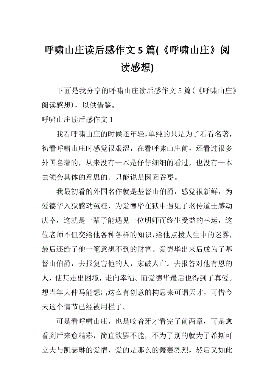 呼啸山庄读后感作文5篇(《呼啸山庄》阅读感想) 下面是我分享的呼啸山庄读后感作文5篇(《呼啸山庄》阅读感想),以供借鉴呼啸山庄读后感作文1 我看呼啸山庄的时候还年轻,单纯的只是为了看看名著,初看呼啸山庄时感觉很艰涩,在看呼啸山庄前,还看过很多外国名著的,从来没有一本是仔仔细细的看过,也没有一本去领会具体的意思的只能说是囫囵吞枣 我最初看的外国名作就是基督山伯爵,感觉很新鲜,为爱德华入狱感动冤枉,为爱德华在狱中遇见了老传道士感动庆幸,这就是一辈子能遇见一位明师而终生受益的幸运,这位老师不但交给他各种各样的知识,给他点拨人生中的迷雾,最后还给了他一笔意想不到的财富爱德华出来后成为了基督山伯爵,去报复害他的人,家破人亡去报答对他有恩的人,使其走出困境,走向幸福而爱德华最后也得到了真爱想当年大仲马能想出这么有创意的构思来可谓天才,可惜今天这个情节已经被用栏了 可是看呼啸山庄,也是咬着牙才看完了前两章,可是愈看到后来愈精彩,简直欲罢不能,不为了别的就为了希斯可立夫与凯瑟琳的爱情,爱的是那么的轰轰烈烈,然后又如此的离经叛道难怪作者艾米莉·勃朗特,写出小说时为英国社会不能接受艾米莉·勃朗特好像早逝不到三十岁,终生没有谈过恋爱。