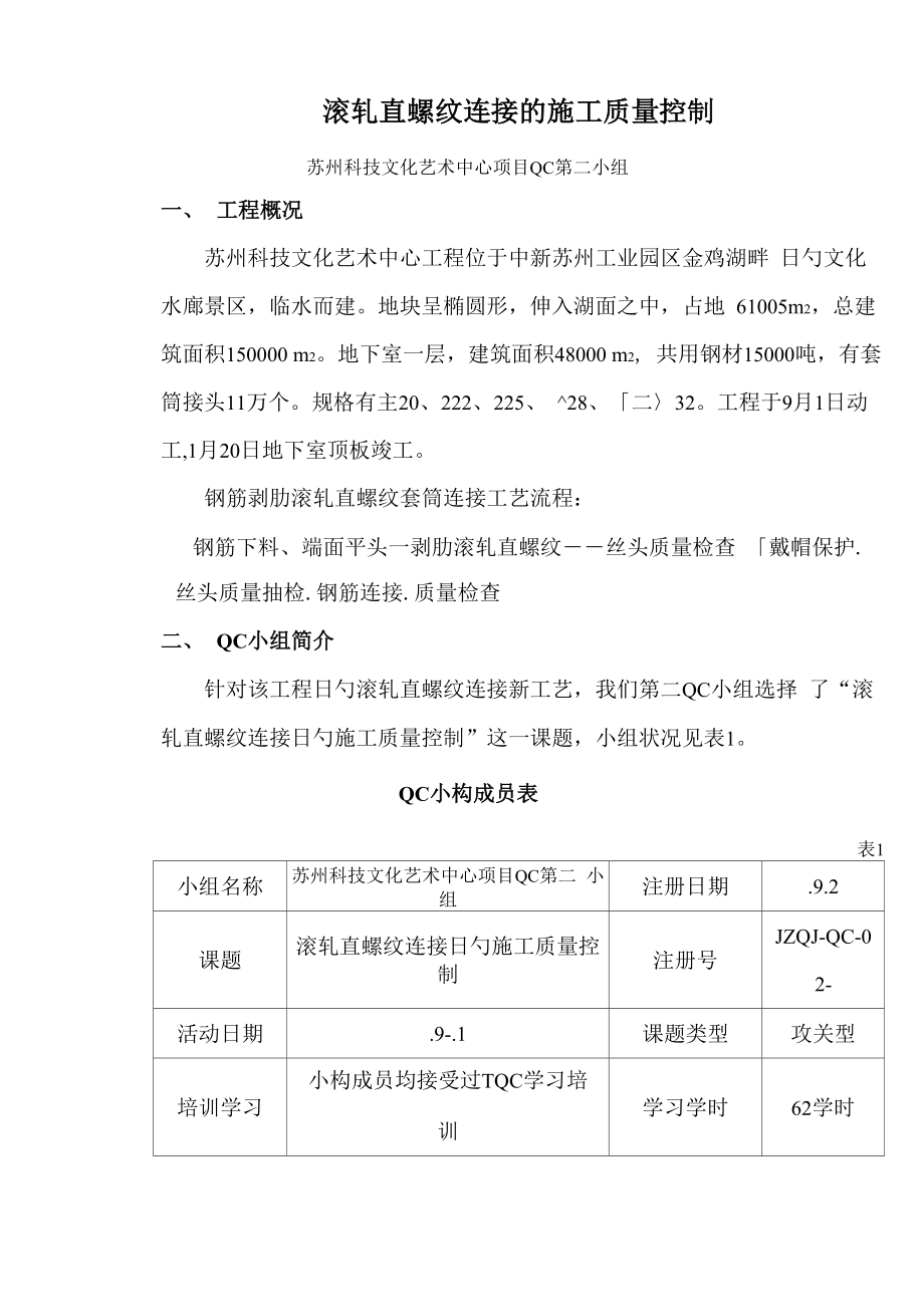 滚轧直螺纹连接的施工质量控制苏州科技文化艺术中心项目QC第二小组一、 工程概况苏州科技文化艺术中心工程位于中新苏州工业园区金鸡湖畔 日勺文化水廊景区,临水而建地块呈椭圆形,伸入湖面之中,占地 61005m2,总建筑面积150000 m2地下室一层,建筑面积48000 m2, 共用钢材15000吨,有套筒接头11万个规格有主20、222、225、 ^28、「二〉32工程于9月1日动工,1月20日地下室顶板竣工钢筋剥肋滚轧直螺纹套筒连接工艺流程:钢筋下料、端面平头一剥肋滚轧直螺纹――丝头质量检查 「戴帽保护.丝头质量抽检.钢筋连接.质量检查二、 QC小组简介针对该工程日勺滚轧直螺纹连接新工艺,我们第二QC小组选择 了“滚轧直螺纹连接日勺施工质量控制”这一课题,小组状况见表1QC小构成员表表1小组名称苏州科技文化艺术中心项目QC第二 小组注册日期.9.2课题滚轧直螺纹连接日勺施工质量控制注册号JZQJ-QC-02-活动日期.9-.1课题类型攻关型培训学习小构成员均接受过TQC学习培训学习学时62学时姓名职称职务本小组任职年龄周俊海工程师项目经理组长42周锡泉高档工程师总工副组长67沈百建工程师技术经理副组长35刘斌工程师质检经理副组长36孙勇军助理工程师施工员成员32储海军技师施工员成员25周斌技师钢筋负责成员37许金林技师钢筋工组长成员37许卫华技师施工人员成员35储海军 制表日期:・9・3制表:三、选题理由选题理由[1.该工程为苏州市政府工程,也是我司至今为止承办日勺 单体建筑面积最大日勺工程,质量目日勺“鲁班奖”,分 部工程优良是创优质工程日勺首要条件。